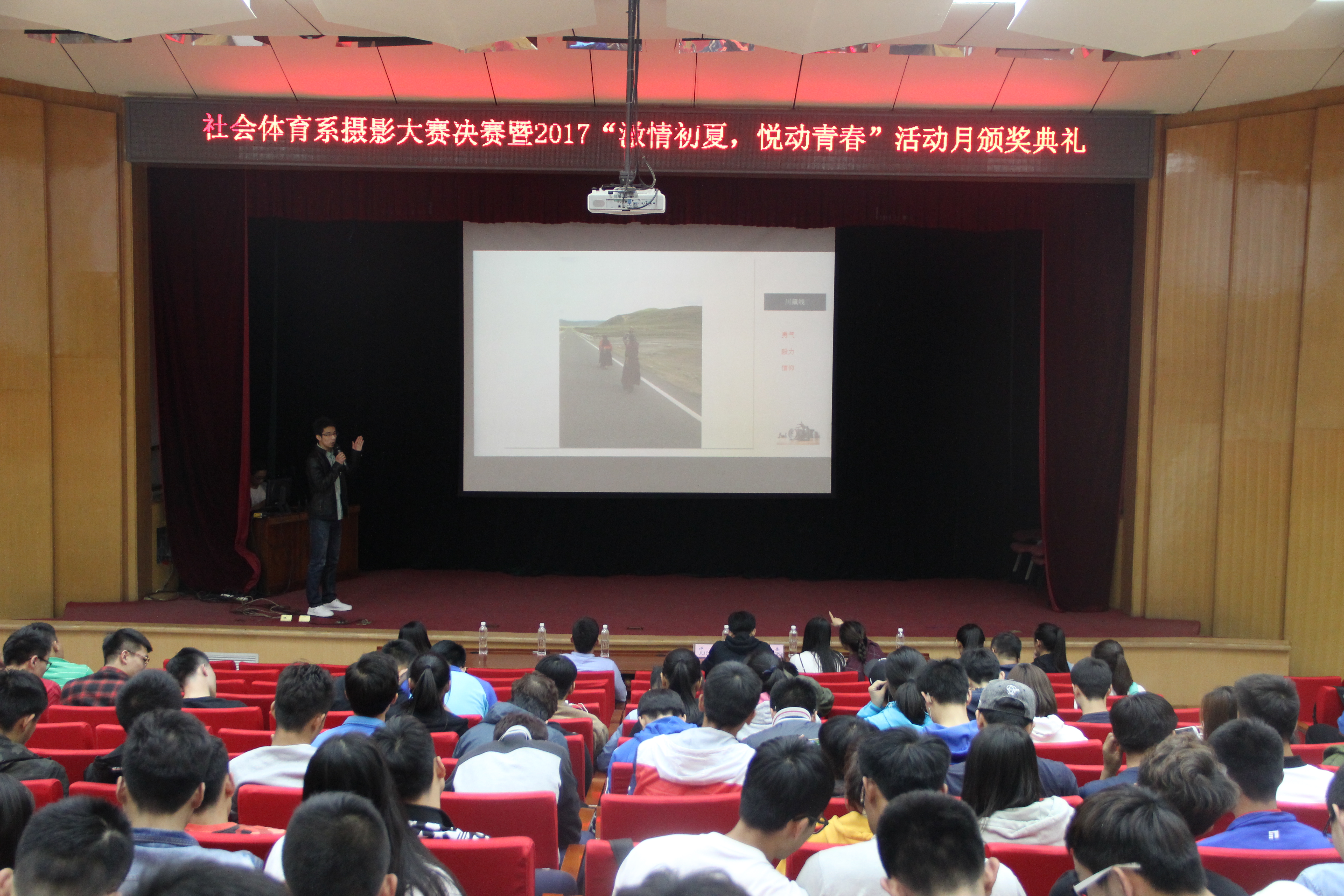 2017年4月26日晚7时,社会体育系摄影大赛决赛暨2017“激情初夏,悦动青春”活动月颁奖典礼在大学生活动中心举行。社会体育系党总支副书记陆璐、社会体育系2014、2016级辅导员沈珂珂、2015级辅导员孙婷婷、社会体育系团总支书记陈子琳等出席本次颁奖典礼。社会体育系三班班主任杨东、社会体育系休闲一班班主任赵鑫、社会体育系休闲二班班主任杨文等也出席了本次晚会并担任摄影大赛评委。 本次颁奖典礼共分为四个板块,第一个板块,“激情绿荫,色彩青春”摄影大赛决赛,第二个板块“激情绿茵,舞动青春”五人制足球赛颁奖,第三个板块“激情校运,社体风云”评选活动的颁奖,第四个板块,“激情绿荫,色彩青春”摄影大赛佳作颁奖。本次摄影大赛共有三人进入决赛,他们从不同的角度展示了自己的摄影经历和技巧,用照片讲述自己的生活。经过评比,来自2016级的叶大望收获冠军。