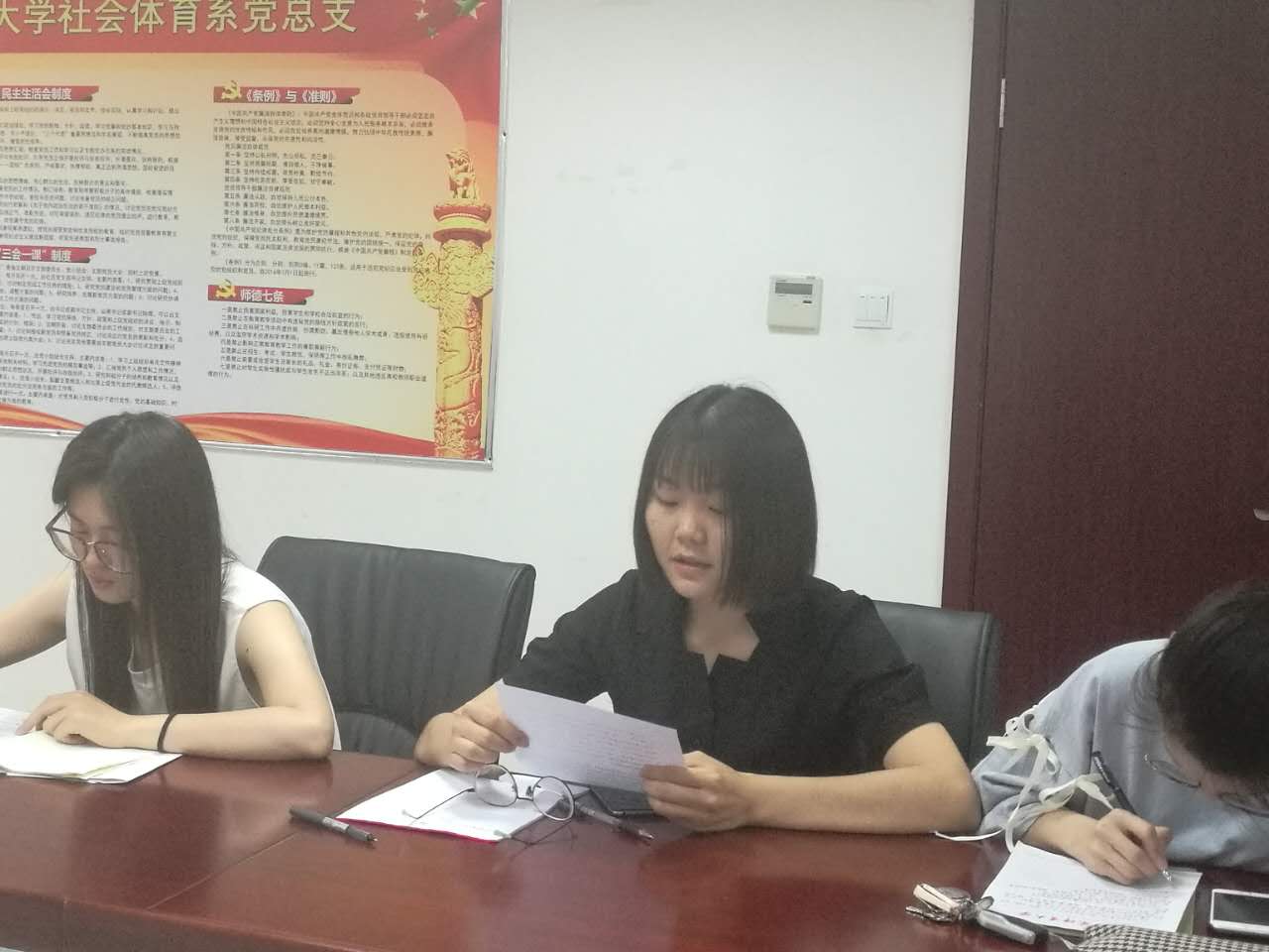 沈珂珂老师对本次会议进行了总结,表达了自己对同学们以及本科生党支部的祝福和期盼。相信社会体育系本科生党员能够脚踏实地干实事,敢于担当,敢于奉献,肩负起时代赋予社会体育系青年学子的历史使命。