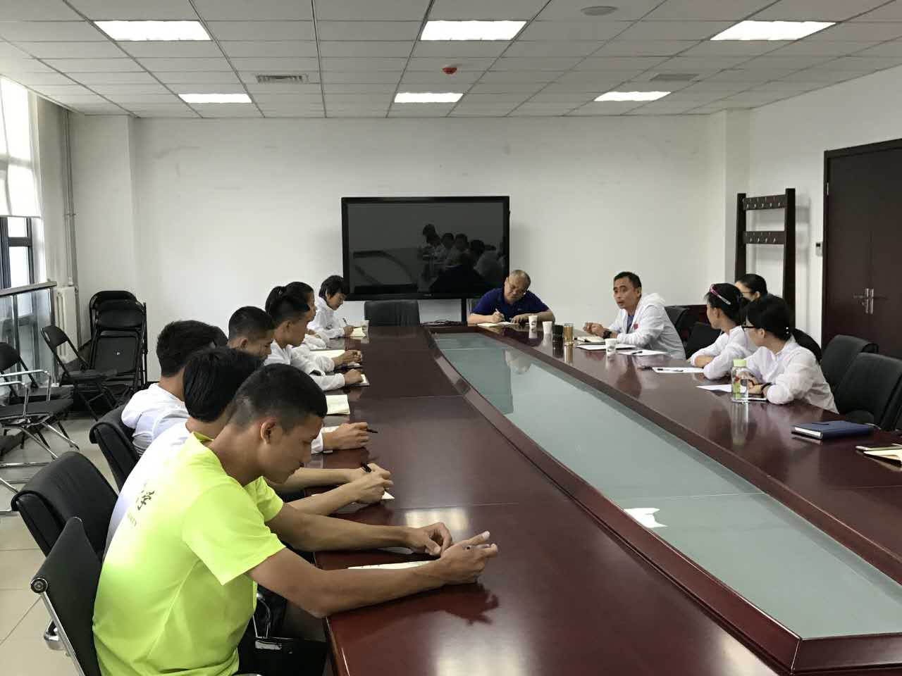 会议中,张健主任首先向参赛队员表达了顺利完成比赛的美好祝愿,希望参赛队员能够在参赛过程中做一个有心人,留心赛事的组织管理细节,丰富知识。陆璐副书记向大家强调了赛事期间的安全问题,建议队员积极备赛,赛前准备好个人物品,赛间注意食品安全和饮食卫生问题。游泳教研室彭义老师对参赛队员们说道:“希望大家放松心态比赛,多增加比赛经验,正常发挥,比出‘铁人’精神”,他建议队员抓住机会,不要胆怯,在比赛中敢打敢拼,队员与团队之间要加强沟通。林健老师希望队员将本次比赛看作外出训练,调整心态,出其不意,比出好成绩。