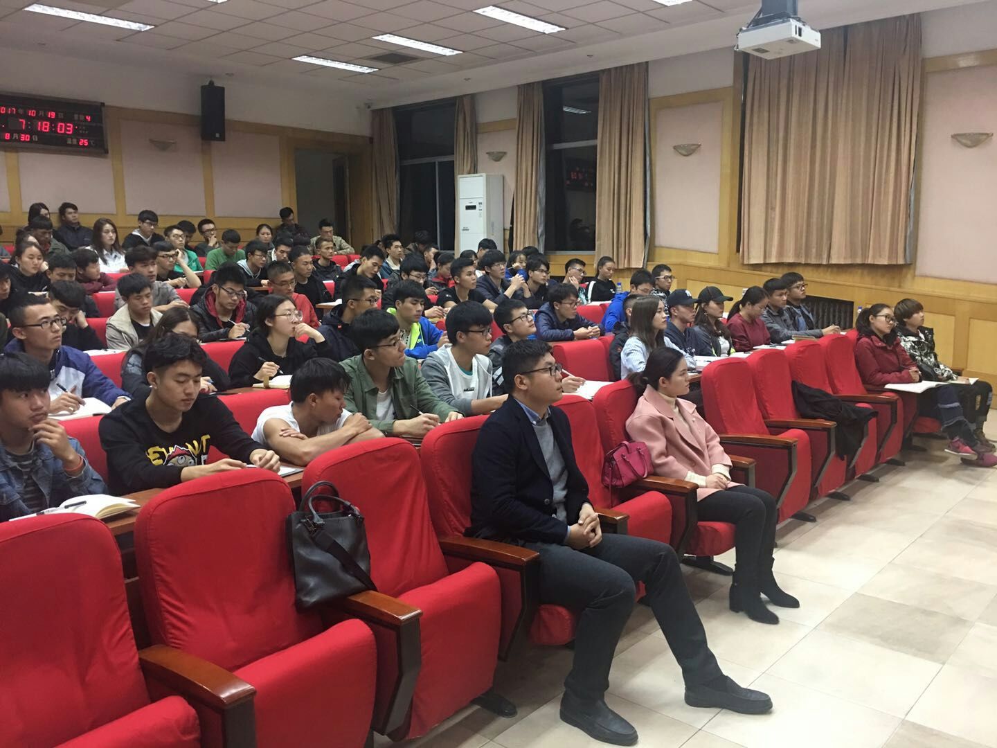 10月19日晚7点,best365学生党员、入党积极分子、全体学生干部以及各年级辅导员在学术报告厅进行专题学习。会议由沈珂珂老师主持,院党总支书记蔡文菊作了“学习十九大精神,争做新时代楷模”的专题讲座。