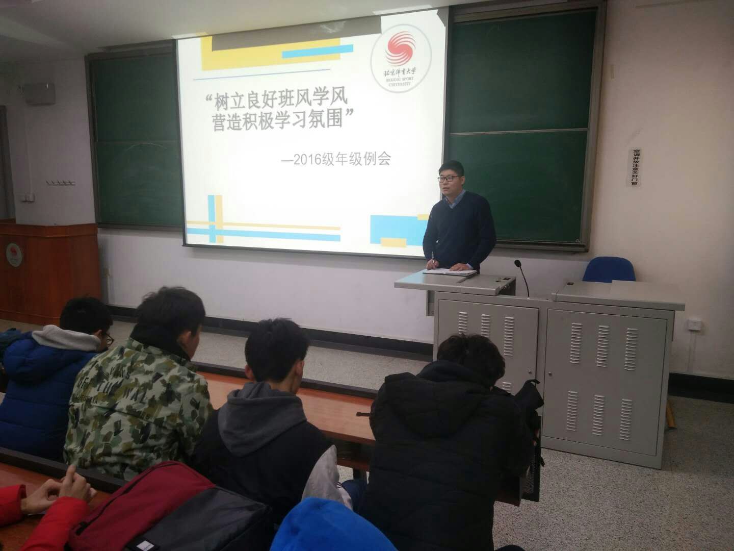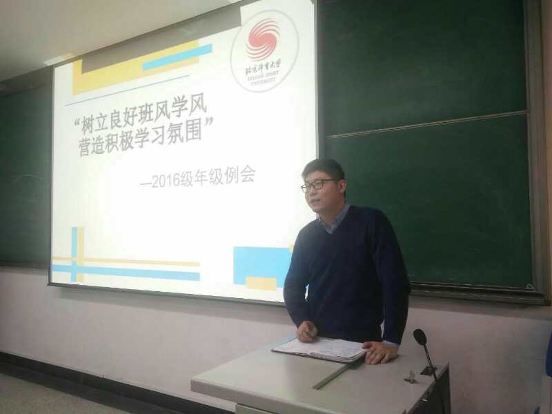 沈老师首先通报了本周年级上课情况,重申了上课的各项纪律要求。希望同学们把握好课堂上的时间,认真做到四个“学好”,即学好基础理论课程,努力提升自身素养;学好术科课程,努力提升专项技术技能;学好专业理论课程,努力提升专业理论水平;学好外语,努力提升国际化水平。最后他号召所有同学参与到学风建设中来,上好每一节课,认真做笔记,不玩手机,不睡觉,希望大家能够在最好的体育大学学到正真的本领。