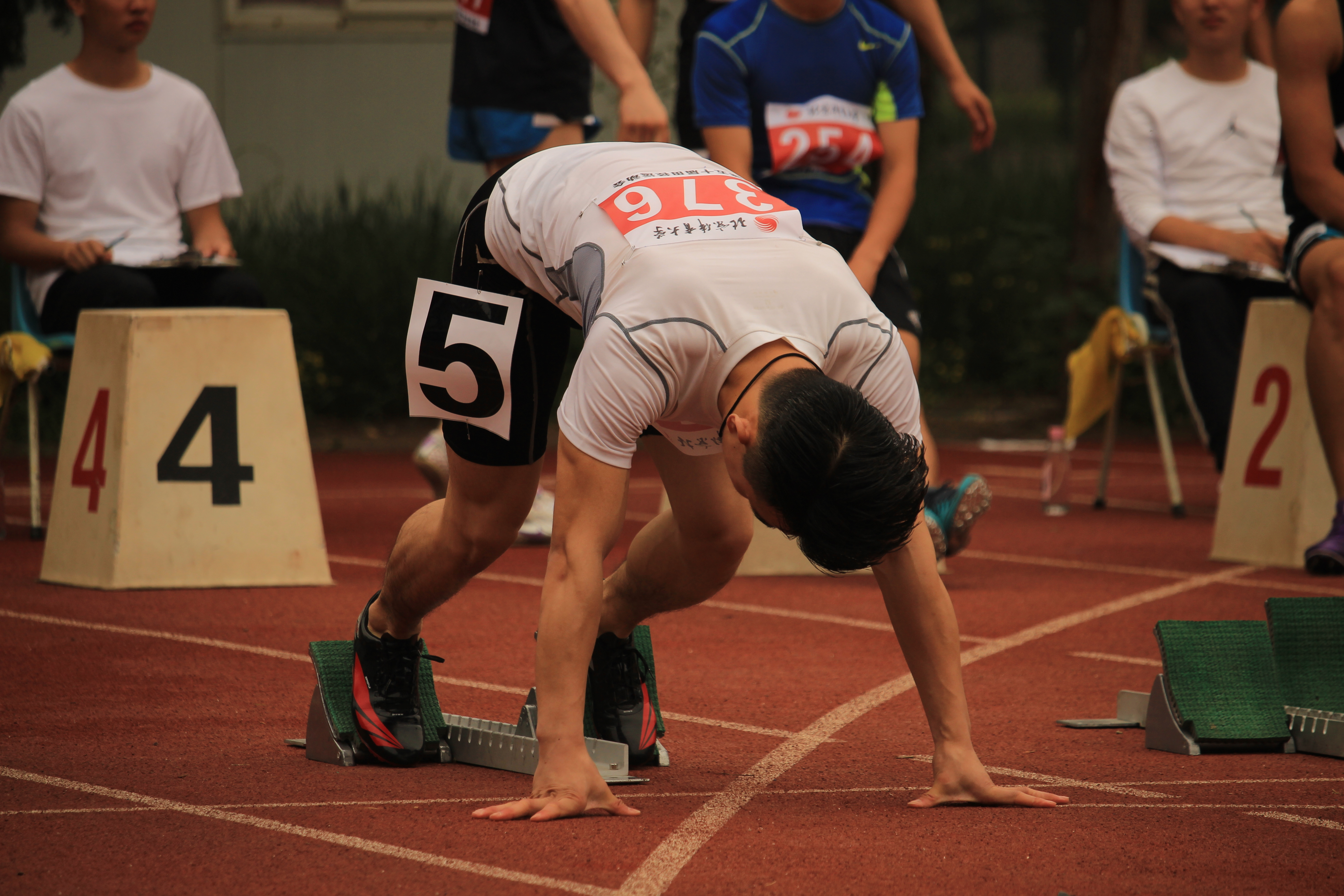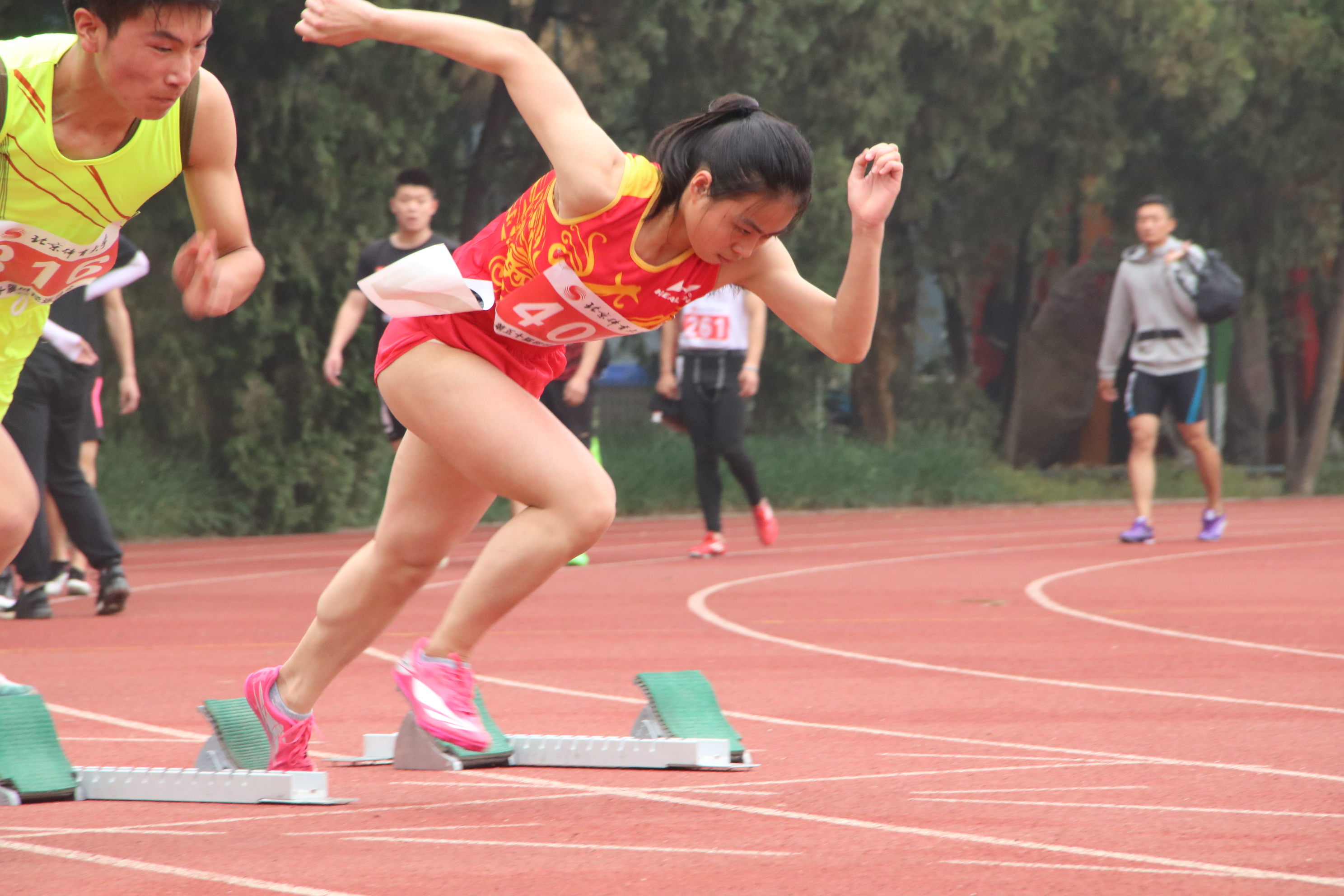 2018年5月16日上午09:20,女子乙组和男子乙组100米预赛在英东田径场举行。代表学院参加女子乙组100米的是405号陈春秀、406号徐浩然;参加男子乙组100米的是376号周明亮、375号李梓凌。