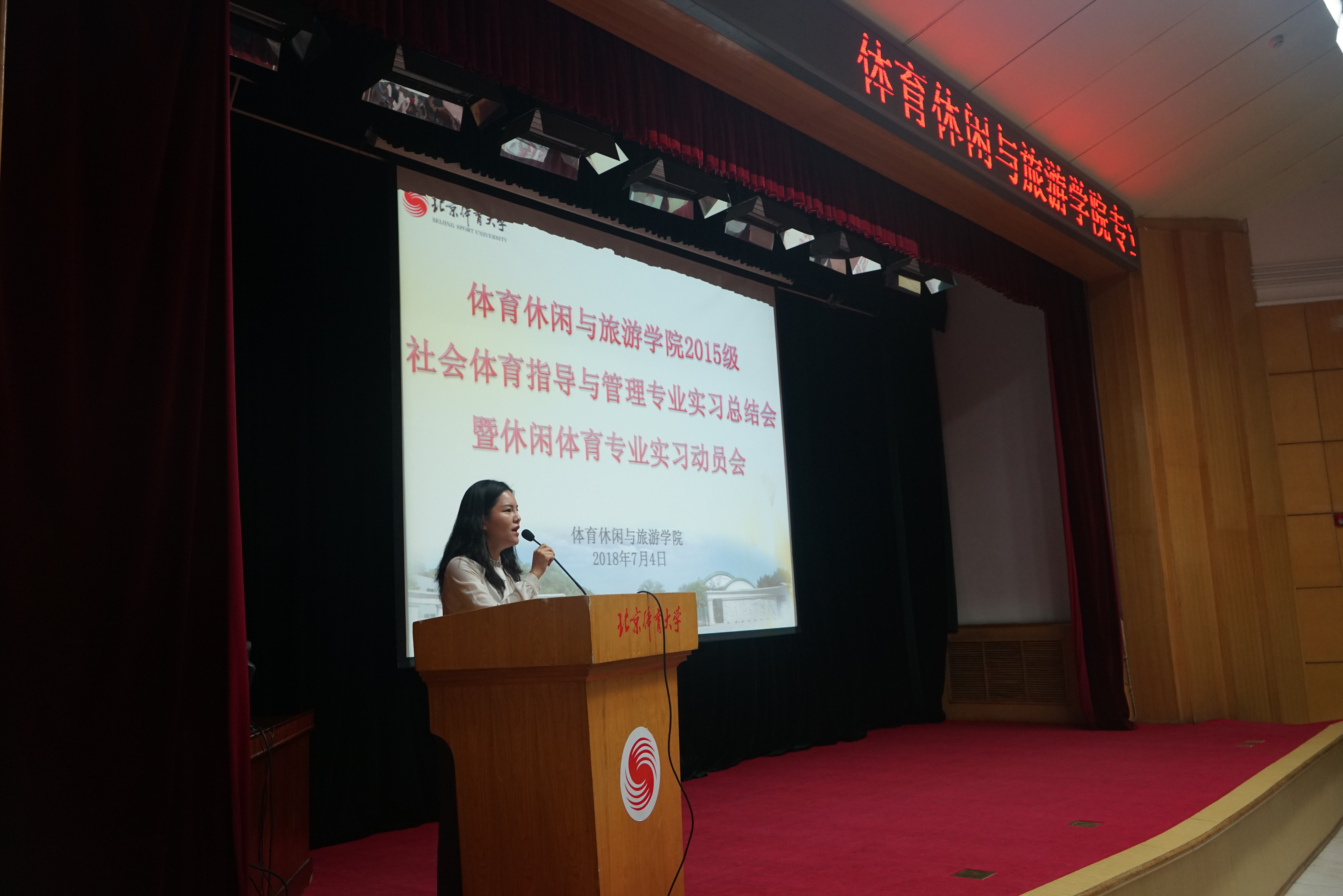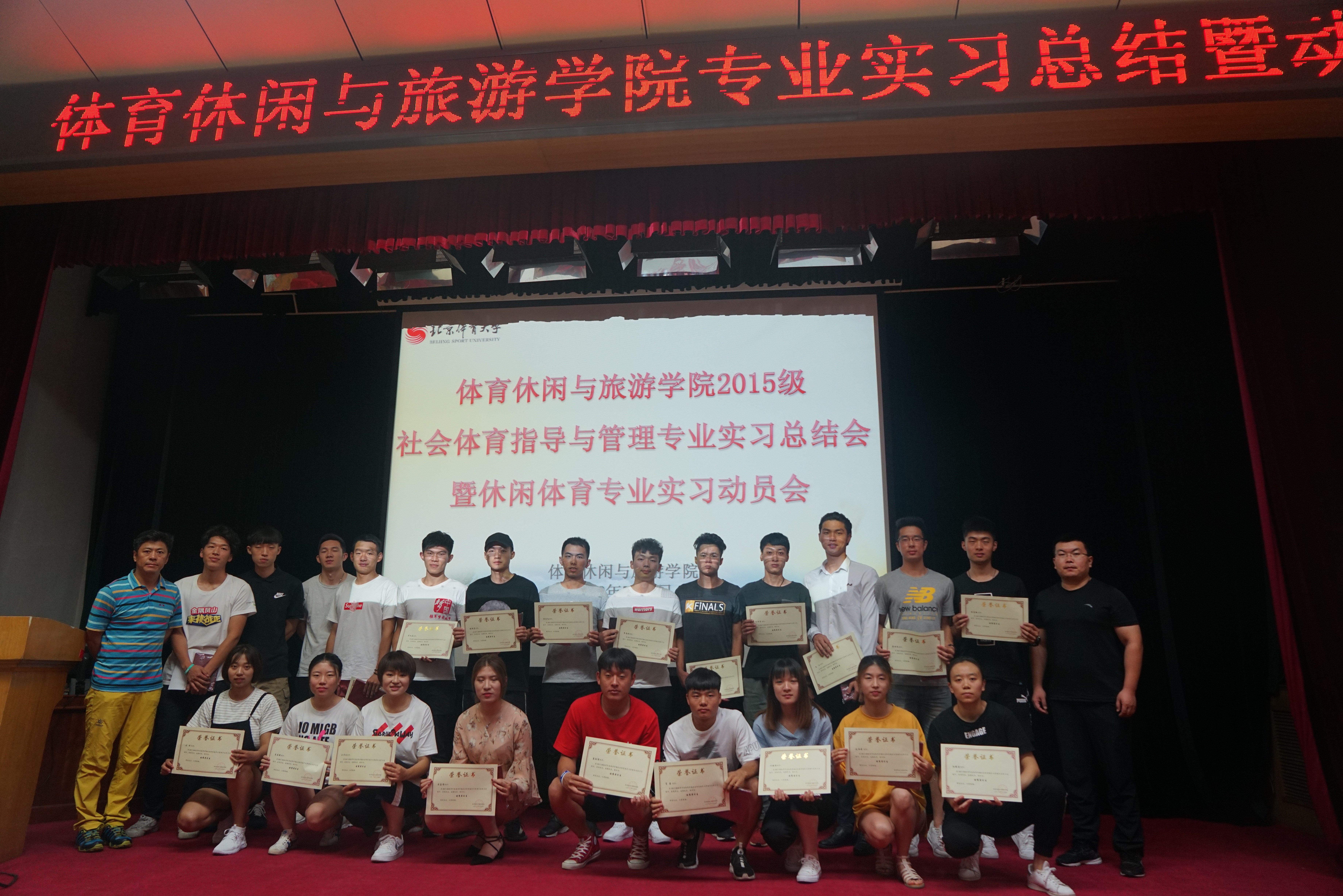 本学期2015级社会体育指导与管理学生专业实习已接近尾声,分布各实习基地的实习队伍已陆续回到学校。为总结专业实习经验,表彰优秀实习生,并动员休闲体育专业实习工作,我院于2018年7月4日上午8点30在大学生活动中心召开了社体专业实习总结表彰暨休闲体育专业实习动员会,出席本次会议的有学院领导、各实习队指导教师及2015级两个专业的全体同学,会议由2015级辅导员孙婷婷主持。